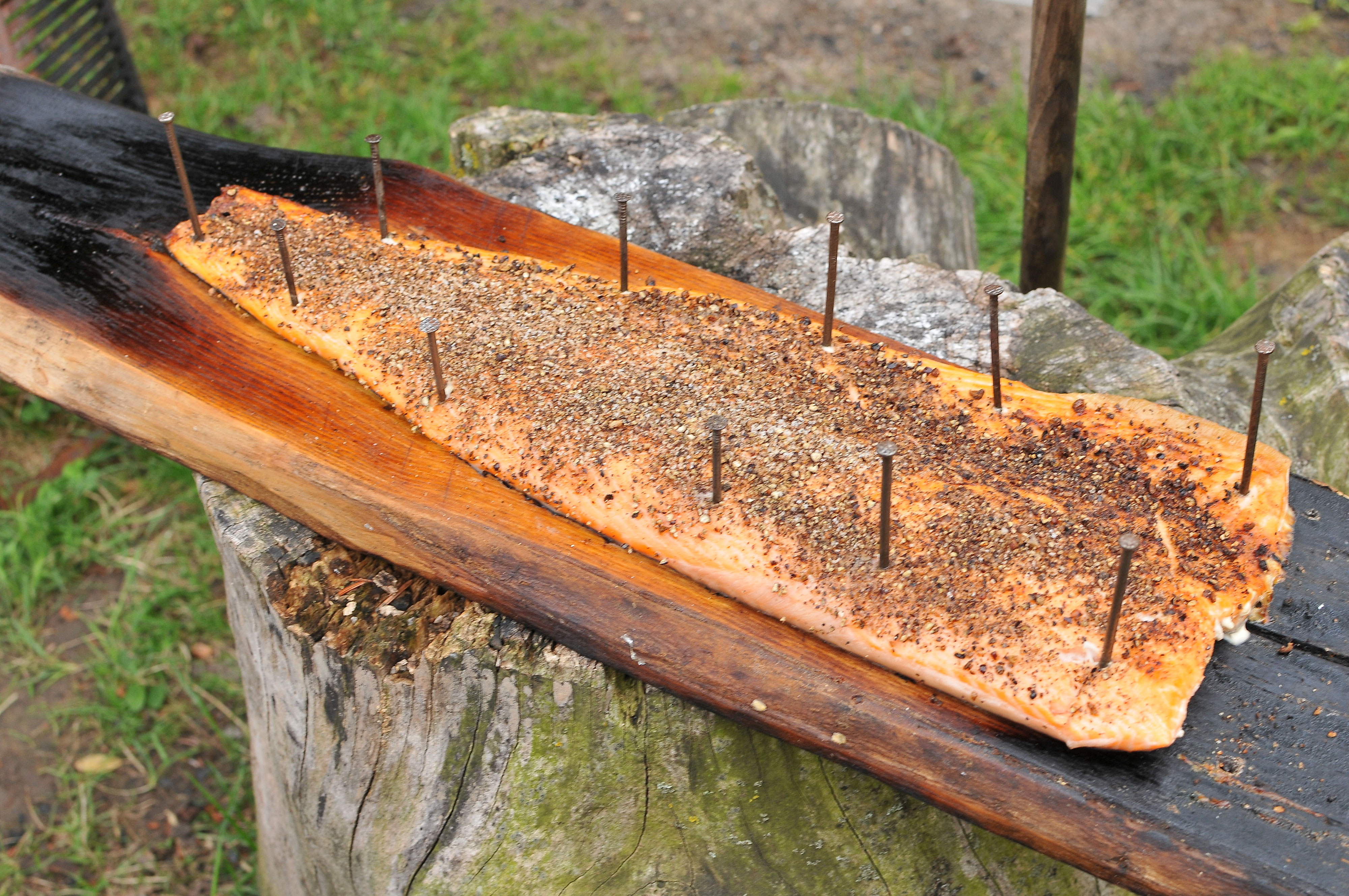 Für das Festnageln benutzen wir ausschließlich rostftreie Nägel. Der Fisch wird dann auf dem Brett der Hitze des Feuers ausgesetzt. Duftend gegarter Lachs mit leichtem Raucharoma der auf der Zunge zergeht.